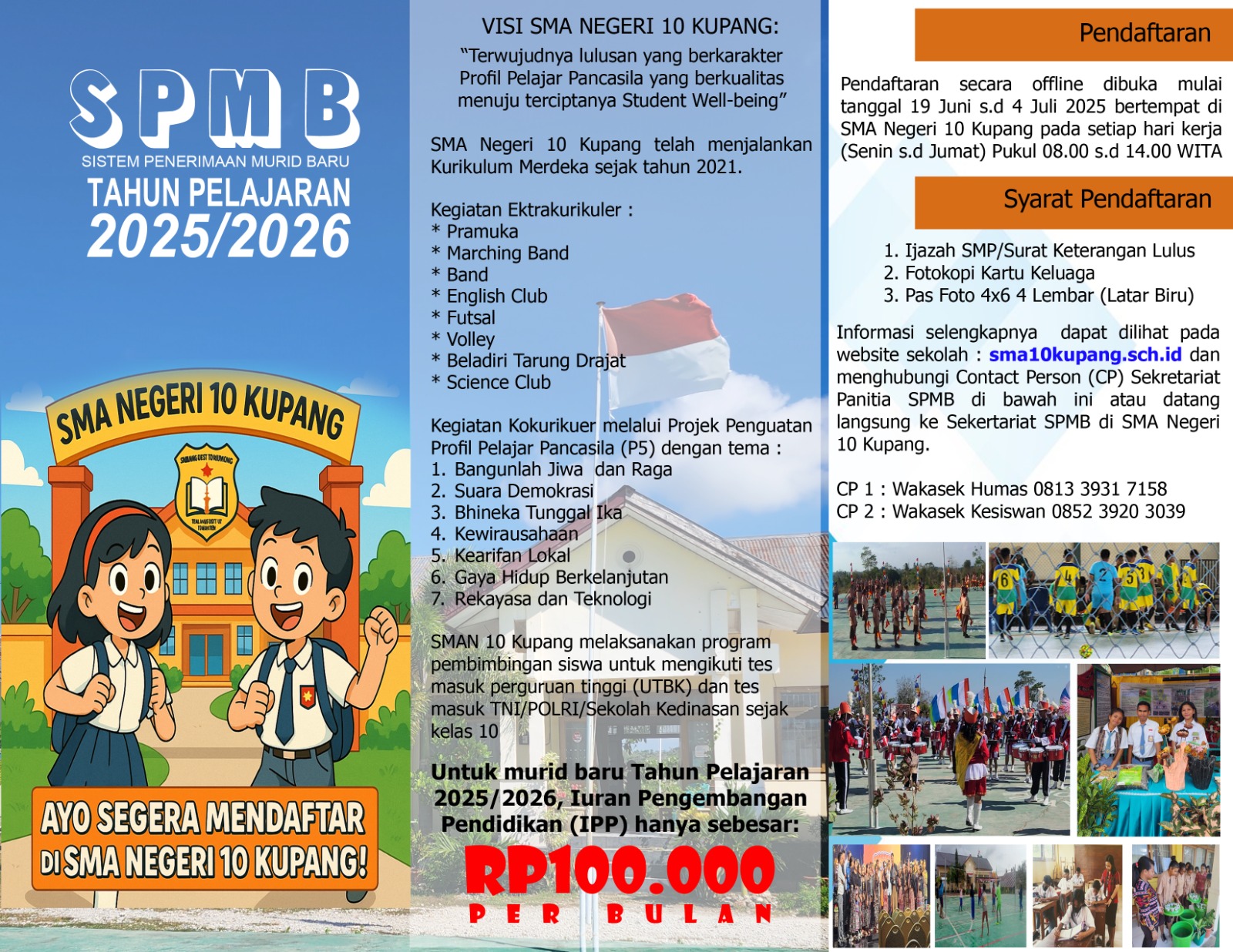 SMA Negeri 10 Kupang (Terakreditasi A) membuka kesempatan bagi calon murid baru untuk bergabung pada Tahun Ajaran 2025/2026 melalui Sistem Penerimaan Murid Baru (SPMB) secara luring/offline (mendaftar secara langsung ke sekolah).